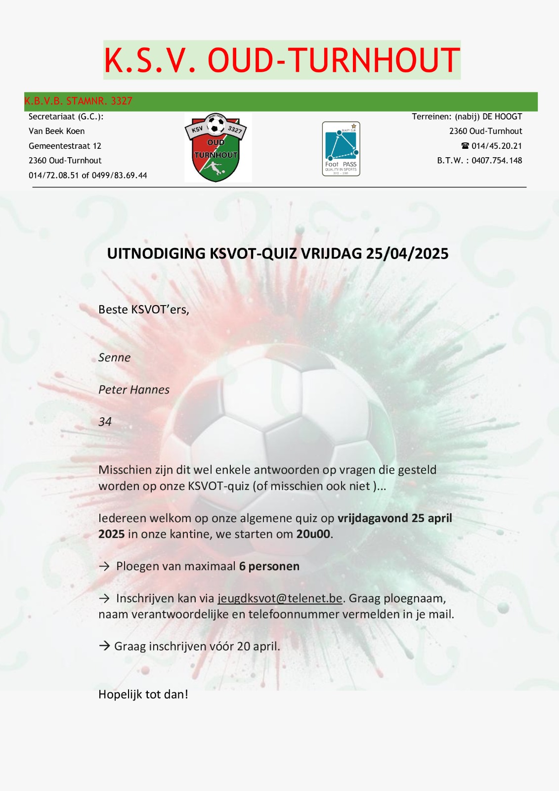 Iedereen meer dan welkom voor onze algemene quiz op vrijdagavond 25 april in onze kantine .